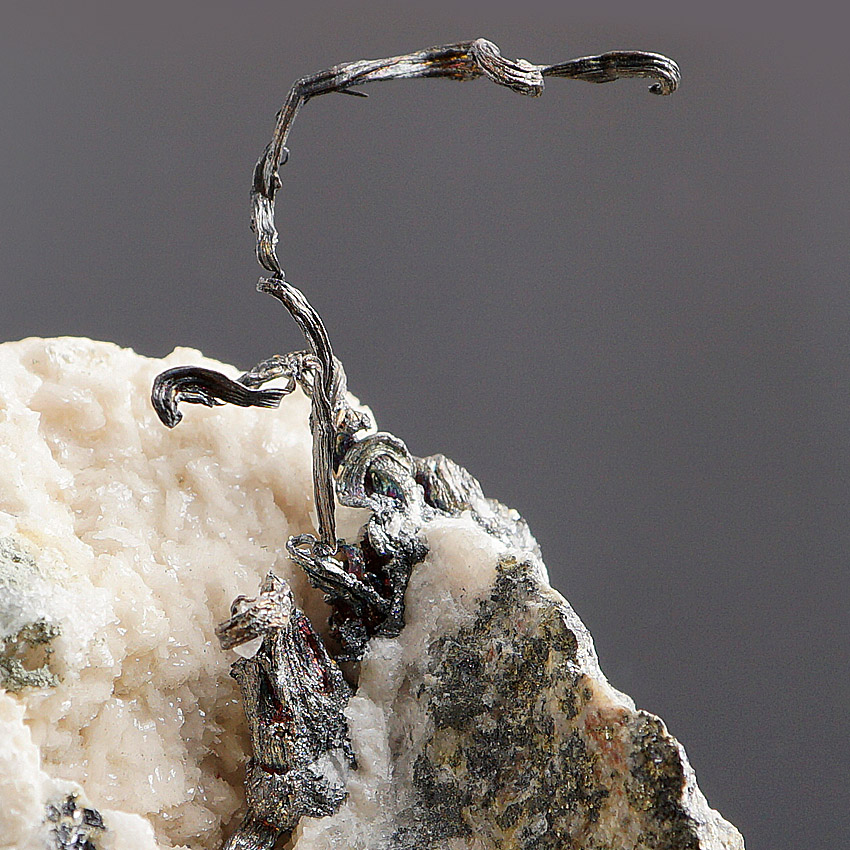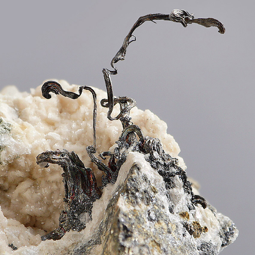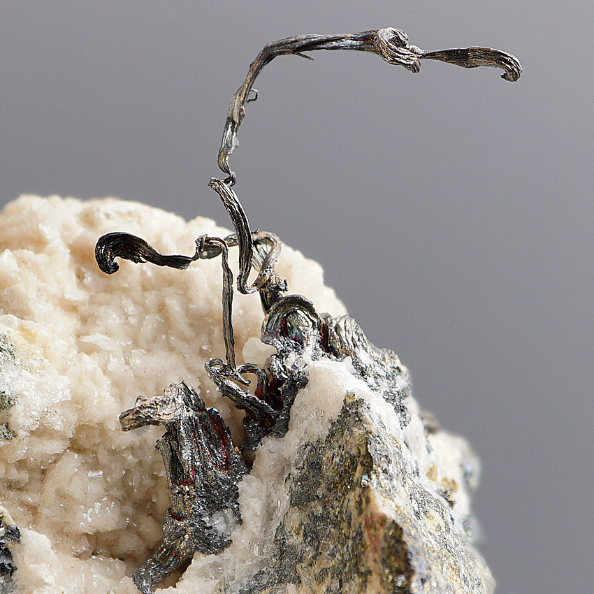 Nice native silver as classic wire silver freestanding on a matrix of crystallized beige dolomite intergrown with yellowish-green-metallic sphalerite (Cleiophane etc.).Very aesthetical specimen from the 66 Line Mine, Lingqiu, Shanxi Province, China.