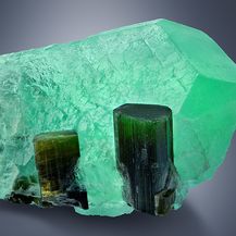 All elbaite crystals are well terminated or recrystallized/rehealed. The fluorite crystal is also undamaged. Only its bottom/back and its left peripherie was in contact with the matrix. All in all a superb fluorite-tourmaline combination which makes colloctors dreams comes true. The specimen was found this year in Stak Nala, Haramosh Mts., Skardu District, Baltistan, Gilgit-Baltistan, Pakistan.