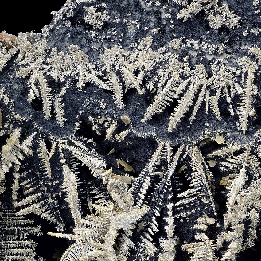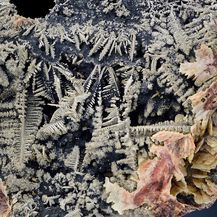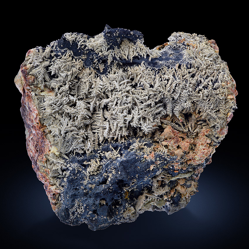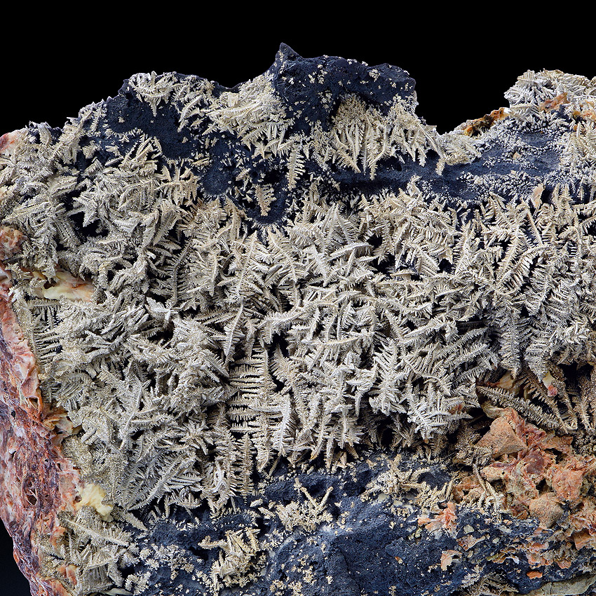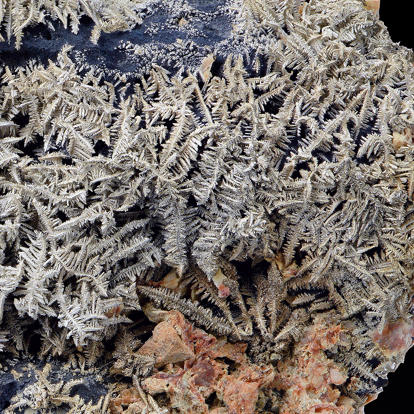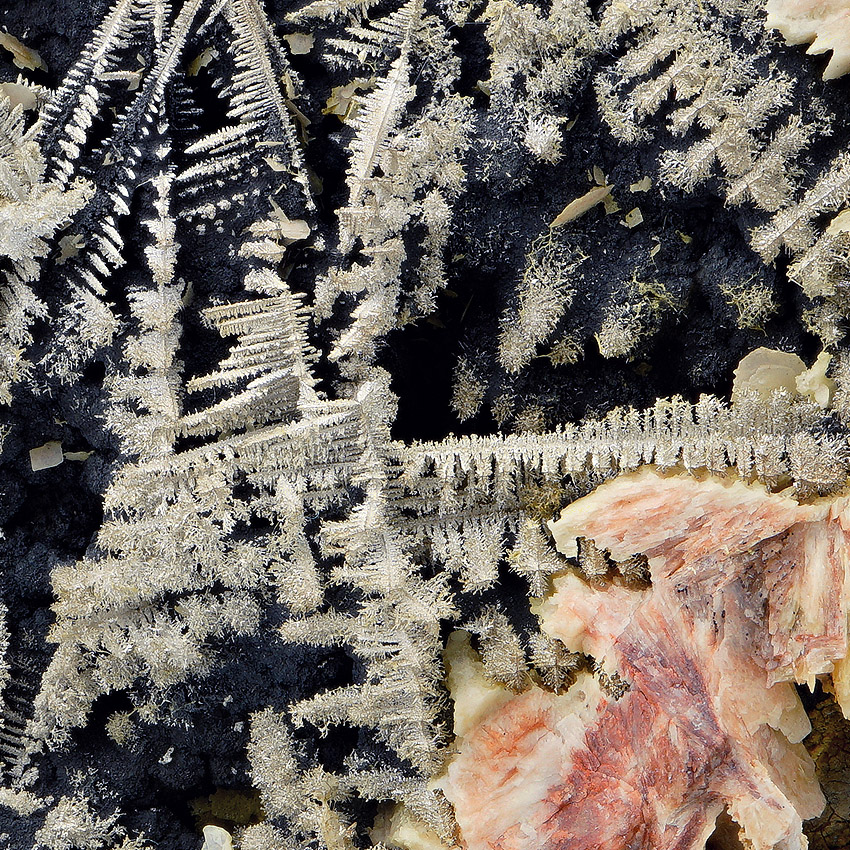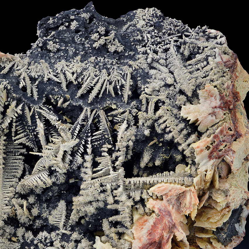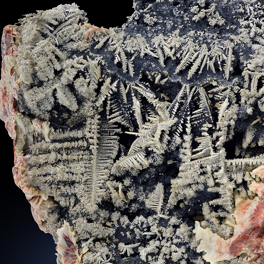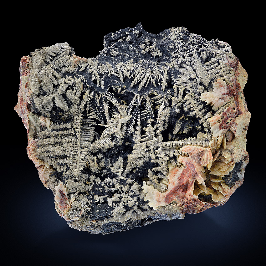 Silvery, sparkling and well formed, herringbone-shaped crystals of native silver to about 2.5 cm in length - well arranged on black native arsenic and at that the whole ensemble is accompanied and framed by beige to pink baryte. All sides of this unique and very aesthetical silver specimen are covered with lustrous metallic silver crystals. On the specimen's back you see smaller but also very well-formed silver crystals (picture 6 and further) .