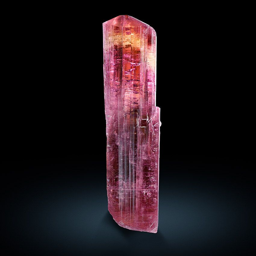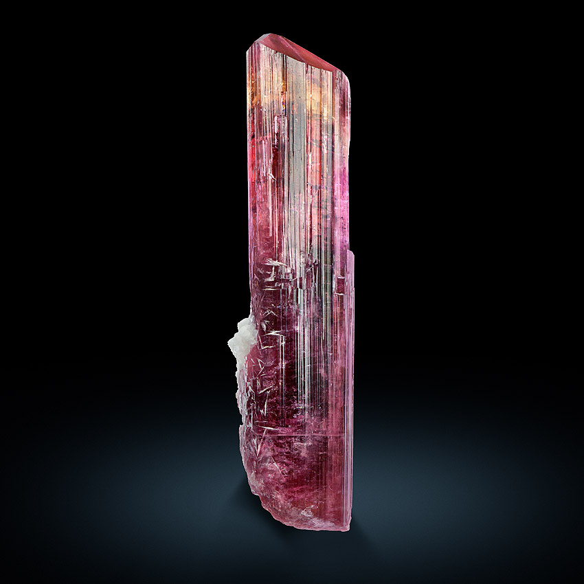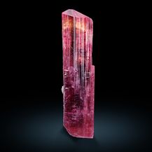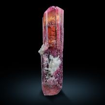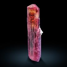 A single, very well-terminated, transparent and magenta-red, striated rubellite crystal in a height of 9.5 cm! The strong color is slightly changing from a nice magenta-red nearby the termination, over an orange-red/yellowish-red to a darker magenta-red body color. Some lepidolite and also cleavelandite can be seen on some of the crystal faces (please look at the pictures). The pictures were taken when backlit the crystal.This crystal is a gemstone because of the unique vivid coloration. That piece comes from the famous Malkhan pegmatite fields, Krasnyi Chikoy, Transbaikal, Eastern Siberia, Russia.