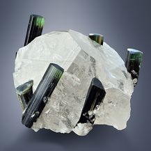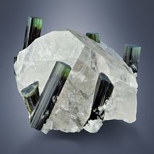 Another unique elbaite-combination: Colorzoned and lustrous, well terminated elbaite crystals up to 2.8 cm in length - freestanding on a single, sharp edged and transparent rock crystal in a size of 5 cm. The elbaite crystals have a dark green body coloration and ends up into yellowish-green- to colorless-zoned terminations.