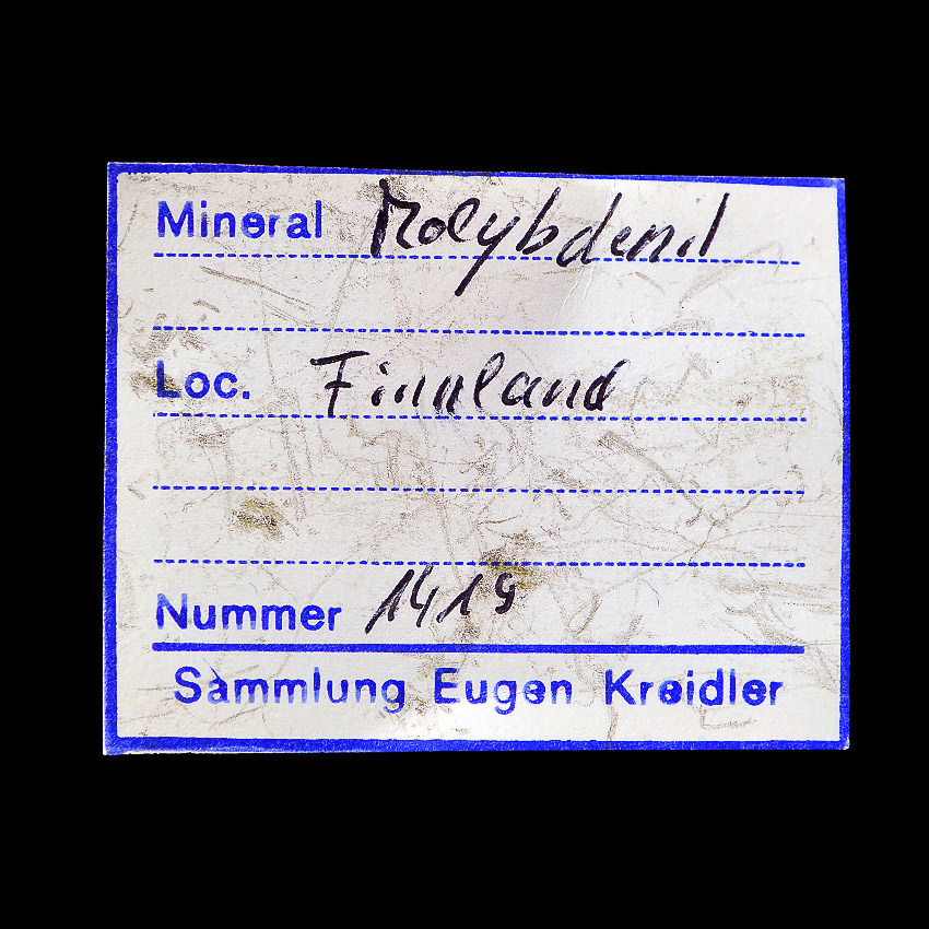 This grey metallic and lustrous specimen is an exceptional large and wellformed sample for a single molybdenite crystal At that the numbered specimen comes from the Ex- Coll. Eugen Kreidler, Germany with its corresponding label.