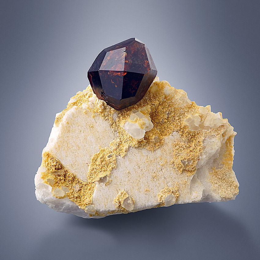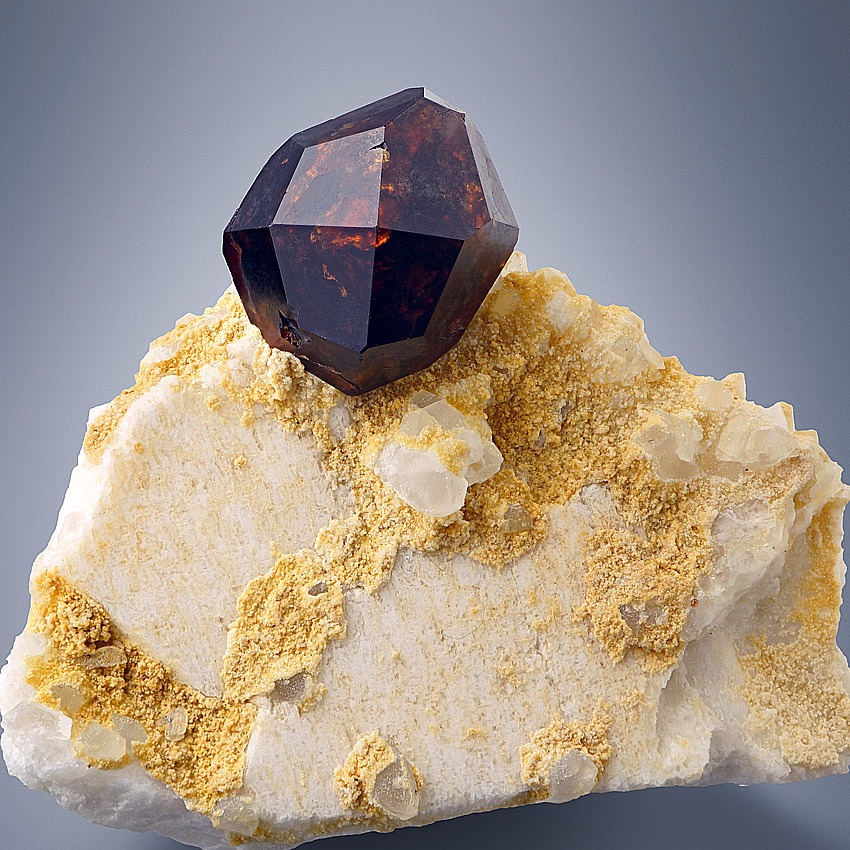 A single, sharp edged and ideal-typic shaped, brownish-red spessartine crystal - perched atop a beige orthoclase plate. The spessartine crystal has a size of 1.9 cm and is fully developed all around. Very impressive miniature for collectors from Shengus, Haramosh Mts., Skardu District, Baltistan, Gilgit-Baltistan, Pakistan.