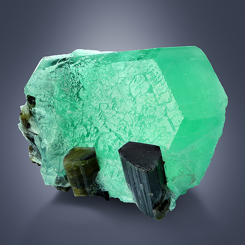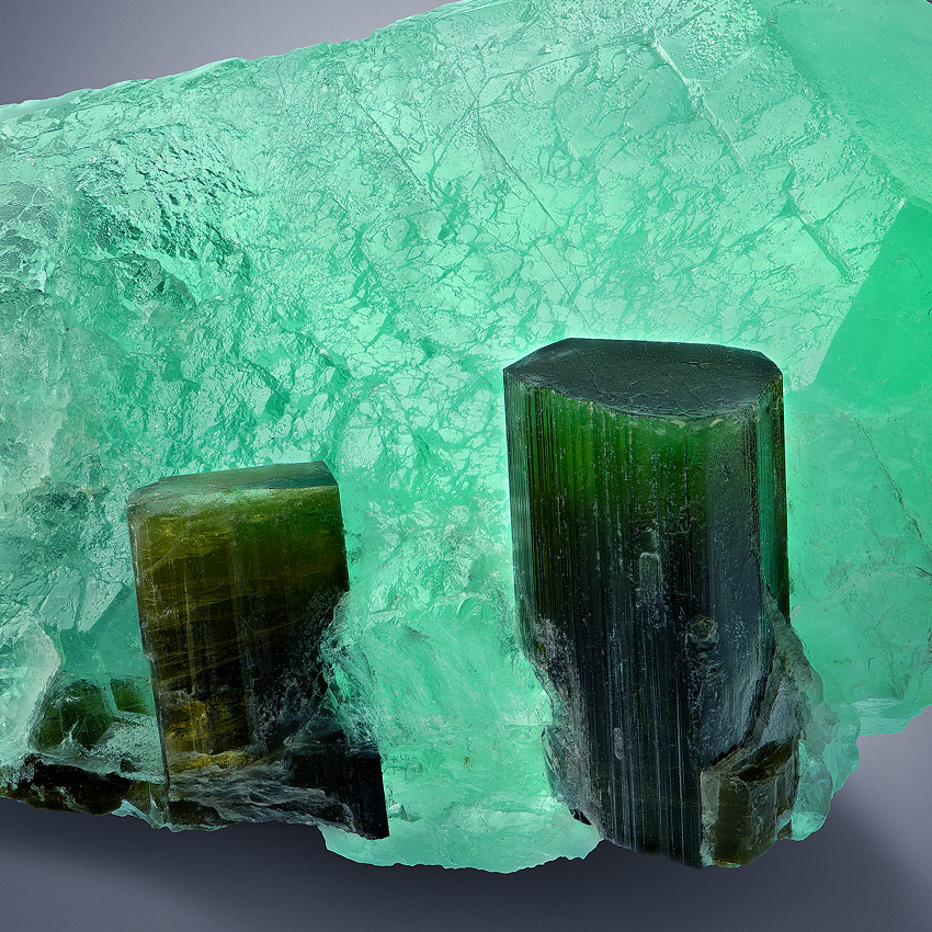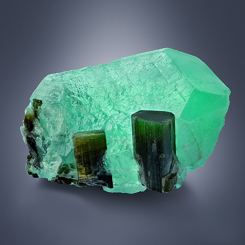 Colorzoned and lustrous, well terminated elbaite crystals up to 1.8 cm in length - freestanding on a single, sharp edged and rich green fluorite cuboctahedron in a size of 5.4 cm. The elbaite crystals have a dark green body coloration and ends up into yellowish-green to colorless zoned terminations.